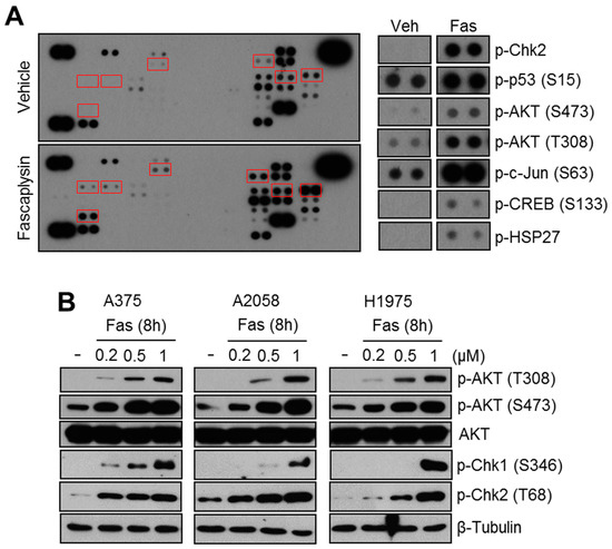 Fascaplysin increases AKT phosphorylation and DNA damage-induced signaling. (A) A375 melanoma cells were incubated with fascaplysin or dimethyl sulfoxide (DMSO) control for 8 h, and 300 μg of total cell lysate was reacted with a phosphorylated kinase proteome profiler membrane. Up- or down-regulated kinases were identified. (B) A375, A2058, and H1975 cells were cultured in the absence or presence of the indicated concentrations of fascaplysin for 8 h, and then proteins were analyzed by Western blotting.