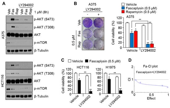 Pharmacological targeting of fascaplysin-induced AKT phosphorylation enhances the anti-cancer effect of fascaplysin. (A) A375 and HCT116 cells were pre-incubated with 10 μM of LY294002 for 20 min, and were then further treated with 1 μM of fascaplysin or rapamycin for 8 h. Protein levels were analyzed by Western blotting. (B,C) A375 cells were pre-incubated with 10 μM of LY294002 for 20 min, and were then treated with 0.5 μM of fascaplysin or rapamycin for 36 h. The cell viability upon treatment of fascaplysin and LY294002 were measured in HCT116 and H1975 cells. Cell viability was measured by using the crystal violet staining assay described in Methods and Materials. (D) A375 cells were incubated with series of dose of fascaplysin and LY294002 for 48 h, and then cell viability was determined by crystal violet assay. The combination index of the synergistic effect of fascaplysin with LY294002 in A375 cells was calculated by the CalcuSyn software 2.1. Values are represented as the mean ± standard deviation (SD) of three independent experiments performed in triplicate; * p < 0.05 and ** p < 0.01.