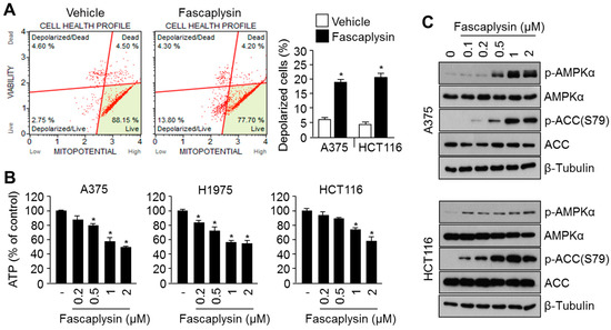 We previously reported that fascaplysin induces apoptosis through activation of caspases cascade [], which is closely linked to mitochondrial stress []. We therefore examined whether fascaplysin causes mitochondrial damage and metabolic stress. Figure 3A shows that fascaplysin increased mitochondrial depolarization. In addition, severe ATP depletion was observed upon fascaplysin treatment in A375, HCT116, and H1975 cancer cells (Figure 3B). As AMPK signaling is activated upon metabolic stress to prevent cell death [,], activation of AMPK was measured upon fascaplysin treatment. Figure 3C shows that fascaplysin dramatically increased phosphorylation of AMPK and its target kinase, acetyl-coA carboxylase (ACC). These results reveal that fascaplysin increases the activation of AMPK signaling, which may be associated with chemoresistance and adaptation to metabolic stress.