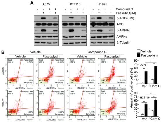Suppression of fascaplysin-induced AMPK activation enhances the anti-cancer effect of fascaplysin. (A) A375, HCT116, and H1975 cells were pre-incubated with 5 μM of compound C for 10 min, and were then further treated with 1 μM of fascaplysin for 6 h. The protein levels were measured by Western blotting; (B) Compound C (5 μM) pre-treated A375 or HCT116 cells were further incubated with fascaplysin (1 μM) for 24 h, and then apoptotic cell numbers were measured using a Muse™ Annexin-V assay kit and a Mini Flow Cytometry Muse™ Cell Analyzer. Values are represented as the mean ± standard deviation (SD) of three independent experiments performed in duplicate; * p < 0.05 and ** p < 0.01.