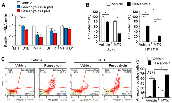 Anti-folate cancer therapy by methotrexate (MTX) enhances the anti-cancer effect of fascaplysin. (A) A375 cells were incubated with the indicated concentrations of fascaplysin or DMSO control for 24 h, and then mRNA levels were measured using quantitative real time (RT)-PCR. Values are represented as the mean ± standard deviation (SD) of three independent experiments performed in duplicate; * p < 0.05; (B) A375 and HCT116 cells were pre-incubated with 0.1 μM of MTX for 10 min, and were then further treated with 0.5 μM of fascaplysin or DMSO control for 24 h. Cell viability was measured using a crystal violet staining assay. Values are represented as the mean ± standard deviation (SD) of three independent experiments performed in triplicate; * p < 0.05; (C) A375 cells were pre-treated with 0.1 μM of MTX for 10 min, and were then further incubated with fascaplysin (0.5 μM) or DMSO control for 24 h. The apoptotic cell numbers were then measured: values are represented as the mean ± standard deviation (SD) of three independent experiments performed in duplicate; * p < 0.05 and ** p < 0.01.