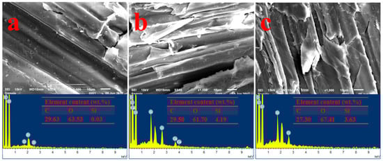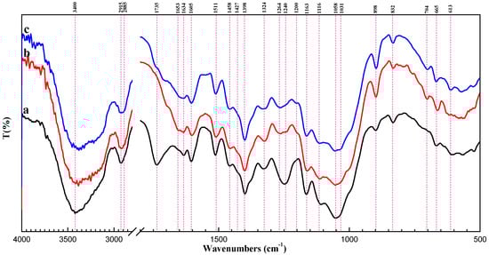 Fourier transform infrared (FT-IR) spectra of primary SCB and SCB-NH2 are shown in Figure 1. Peaks at 3400, 2915 and 2885 cm−1 for SCB are due to stretching of –OH, –CH3, and –CH2 groups, respectively (Figure1a) [34]. Peaks at 1427, 1398, 1163, 1058, and 898 cm−1 are assigned to the characteristic vibrations of cellulose [35]; and the peak at 1735 cm−1 is assigned to the stretching vibration of acetyl groups attached to hemicellulose in the raw material [36]. Signals at 1634, 1605, 1511, 1458, 1324, 1264, 1200, 1116, and 832 cm−1 are ascribed to the characteristic vibrations of aromatic rings in lignin [37]. The results are in agreement with the primary component of SCB (Table S1).