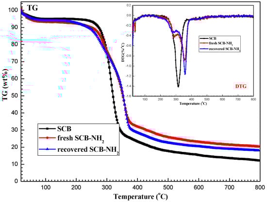 The thermal stabilities of SCB and SCB-NH2 were also investigated by thermogravimetry analysis method (TG). The thermal decomposition profiles are presented in Figure 3. In all samples, the first weight loss stage below 100 °C was ~5%, which is associated with the evaporation of water adsorbed in the samples. As for SCB sample, the second weight loss stage (~64%) started at 250 °C and then proceeded rapidly below 350 °C. At 800 °C, refractory constituents (~12%) such as tar and/or char and inorganic salts remained. Weight loss peaking at 315 °C in the differential thermogravimetry (DTG) curve indicates the rapid decomposition of hemicellulose, cellulose and lignin in raw material [43]. The second weight loss stage of SCB-NH2 began at 260 °C and proceeded rapidly to the third weight loss stage at 325 °C with weight loss of 20% and 35% respectively, leaving refractory constituents (~20%) containing tar and/or char, inorganic salts, and SiO2 at 800 °C [44]. The characteristic weight-loss peaks at 287 °C and 360 °C is due to the rapid decomposition of hemicellulose and grafted groups (–NH2, –(CH2)n–, etc.). The weight-loss at 360 °C is possible caused by the combination of cellulose and lignin. This process for SCB-NH2 is 45 °C higher than those in raw material showed above. This implies the protection effect of silicane coupling agent on SCB, which further illustrates that SCB support is stable in amination process.