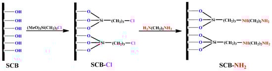As shown in Scheme 2, SCB-NH2 is first prepared by treating the dried SCB with (3-chloropropyl)trimethoxysilane (CTEOS) (step I) and then modified with ethylenediamine through the amination (step II) [50,51,52,53]. In a typical procedure, dried SCB (2.0 g) was first added into anhydrous toluene (100 mL), then 1.0 g (~5.0 mmol) of (3-chloropropyl)trimethoxysilane and 0.1 mL (~5.5 mmol) of H2O were added to this suspension, the mixture was further stirred and heated to reflux for 4 h, subsequently, 1.5 g (~25mmol) ethylenediamine was added dropwise. After being refluxed for another 4 h, the mixture was filtrated and washed by EtOH for three times and dried in vacuum oven at 80 °C for 24 h. The obtained material was denoted as SCB-NH2.