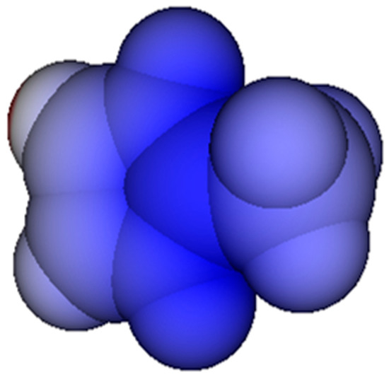 Charge distribution on the VdW surface of the 2-methylimidazolium ion. Positive charge intensity indicated by depth of blue color. (EHMO calculation and graphics by ChemBrain IXL).