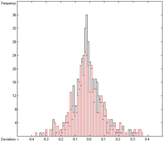 The correlation diagram in Figure 2 reveals a very good compliance between the training and cross-validation results, confirmed by the close similarity of standard deviations R2 and Q2 (lines B and F in Table 2). The corresponding histogram in Figure 3 exhibits a slightly distorted Gaussian bell curve, the maximum of which being shifted by 0.02 to the negative deviations (indicating smaller experimental values than predicted), which might be ascribed to the relatively small number of experimental data.
