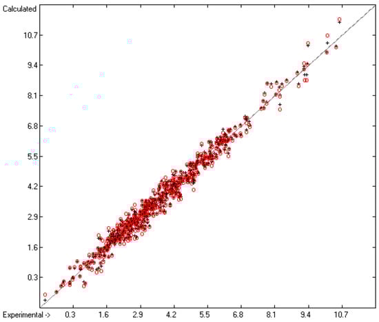 Generally, the activity coefficient γ∞ has been published in its logartithmic form log(γ)∞ and has been measured at 298.15 K. In some cases, where γ∞ itself or its logarithmus naturalis was cited, the data have been translated into their decimal logarithm. In addition, only values have been considered which have been measured at or reduced to 298.15 K. Primary sources of experimental data have been the collective reports mentioned earlier [8,9]. Additional data have been found for 1-propoxypropan-2-ol [73], several alkyl and alkenyl alcohols and alkylbenzenes [74], valeric and crotonic aldehyde [75], variously substituted benzoic acids [76,77], naphthoic acids [78,79], isatin [80], 2-cyanoguanidine [81], florfenicol [82], thiamphenicol [83] and various sulfonamides [84,85]. In total, the number of compounds with experimental log(γ)∞ data amounted to 709, of which 34 turned out to be outliers (a list of them is available in the Supplementary Materials), as their experimental values differed by more than three times the cross-validated standard error from prediction. The remaining 675 compounds represented 113 atom groups, of which 75 have been defined as valid for predictions (see line A of Table 3). A number of calculations, which tentatively in- or excluded certain special groups, revealed that consideration of alkanes and unsaturated hydrocarbons (special groups 115 and 116 in Table 3) as separate entities significantly improved the values of the correlation coefficient R2 (from 0.9621 to 0.9788) as well as the corresponding standard error (from 0.37 to 0.27), whereas the inclusion of intramolecular hydrogen bonds (special group 114) only had a minor effect, probably due to the small number of only six examples. Nevertheless, in view of future data input this latter group has been left in the parameters table.