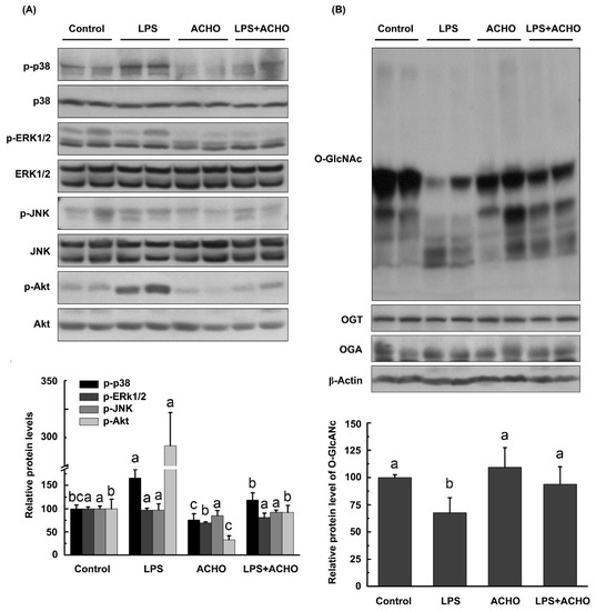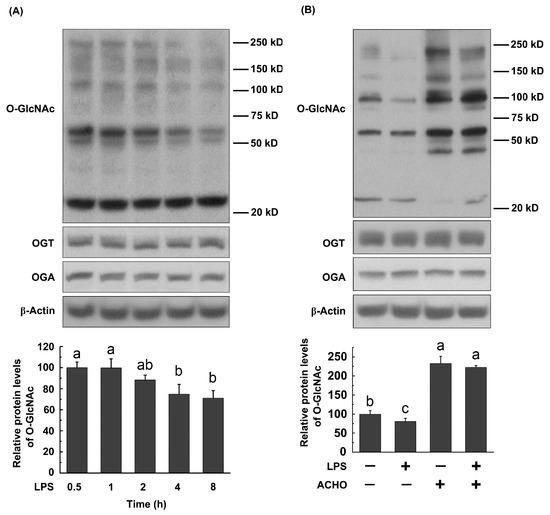 Effects of LPS and ACHO on protein O-GlcNAcylation in macrophage cells. (A) RAW264.7 cells were treated with LPS (200 ng/mL) for 0–8 h; (B) RAW264.7 cells were pretreated with ACHO (100 µg/mL) for 12 h and then exposed to LPS (200 ng/mL) for 8 h. After that, cells were collected and analyzed by western blot. Data are represented as the mean ± SD (n = 3). Data with different superscript letters are significantly different (p < 0.05).