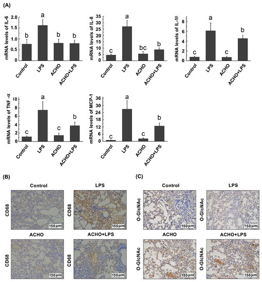 Effect of ACHO on transcriptional activation of pro-inflammatory cytokines (A), macrophage infiltration (B) and protein O-GlcNAcylation (C) in lung tissues of LPS-injected mice. C57BL/6 mice were pre-treated with ACHO (1 mg/mL in drinking water) for two weeks followed by LPS (3 mg/kg) injection intraperitoneally for 24 h. After that, mice were euthanized, and lung tissues were collected for RT-PCR assay or immunochemistry assay. (A) Expression of pro-inflammatory cytokines at mRNA level in lung tissues of LPS-injected mice, including IL-6, IL-8, IL-1β, TNF-α and MCP-1; (B) Effect of ACHO on CD68 (cluster of differentiation 68) production in lung tissues of LPS-injected mice (×200); (C) Effect of ACHO on protein O-GlcNAcylation in lung tissues of LPS-injected mice (×200). Data represent the mean ± SD (n = 5). Data with different superscript letters are significantly different (p < 0.05).