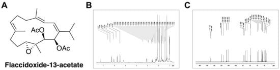 (A) Chemical structure of laccidoxide-13-acetate; (B) 1H NMR spectrum of flaccidoxide-13-acetate in CDCl3 at 400 MHz; (C) 13C NMR spectrum of flaccidoxide-13-acetate in CDCl3 at 100 MHz.