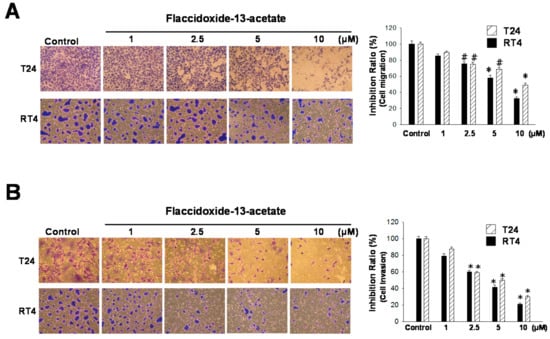 Flaccidoxide-13-acetate inhibits T24 and RT4 cell migration and invasion. (A) Effects of flaccidoxide-13-acetate on the inhibition of T24 and RT4 cell migration; (B) Effects of flaccidoxide-13-acetate on the inhibition of T24 and RT4 cell invasion. Control cells were treated with DMSO vehicle. Three independent experiments were performed for each assay. (# p < 0.05, * p < 0.001).