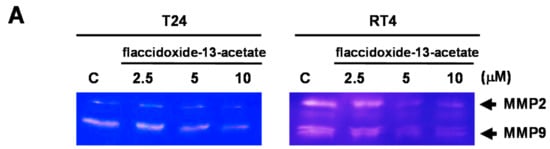 The activities of MMP-2/-9 in conditioned media were measured using gelatin zymography, as described previously by Chen et al. [40]. Briefly, cells were incubated for 24 h with different concentrations of flaccidoxide-13-acetate, and the culture media were collected. Samples were separated by 10% SDS-PAGE containing 0.2% gelatin under non-reducing conditions. Separation was achieved, and the gels were washed three times in washing buffer (100 mM NaCl, 2.5% Triton-X 100, 50 mM Tris-HCl, pH = 7.5), then activated in reaction buffer (200 mM NaCl, 1 mM CaCl2, 0.02% NaN3, 1 µM ZnCl2, 2% Triton-X 100, 50 mM Tris-HCl buffer, pH = 7.5) for 24 h at 37 °C. Finally, the gels were stained (Coomassie Blue R-250) then de-stained.