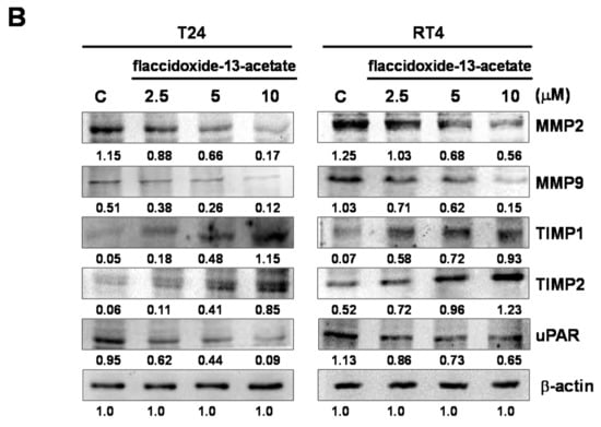 MMP-2 and MMP-9 are members of the matrix metalloproteinase (MMP) protein family, and have the ability to cleave collagen and other types of extracellular matrix (ECM). Both MMP-2 and MMP-9 are known to be associated with metastasis and angiogenesis. The results of zymography showed that with increasing concentrations of flaccidoxide-13-acetate (2.5–10 μM), the activities of MMP-2 and MMP-9 decreased in both T24 and RT4 cells (Figure 3A). In addition, the results of western blotting also revealed that the protein expressions levels of MMP-2, MMP-9 and uPAR were increasingly inhibited upon treatment with increasing concentrations of flaccidoxide-13-acetate, while the levels of TIMP-1 and TIMP-2 were increased (Figure 3B).