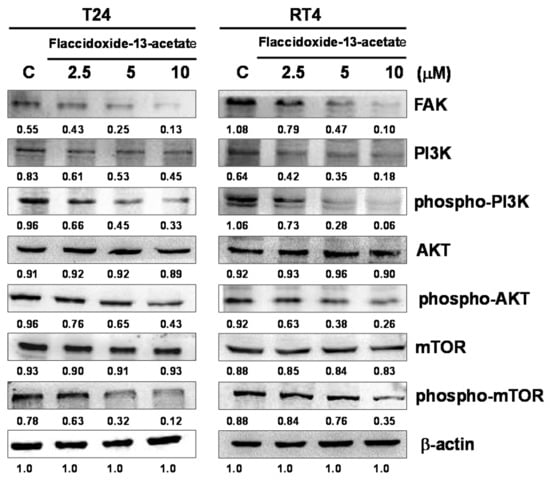 Flaccidoxide-13-acetate regulated the expression levels of mTOR signaling pathway proteins. Western blotting analysis demonstrated the changes in expressions levels of FAK, PI3K, phosphorylated-PI3K, AKT, phosphorylated-AKT, mTOR and phosphorylated-mTOR in T24 and RT4 cells treated with flaccidoxide-13-acetate. C: cells treated with DMSO vehicle only. β-actin was used as the protein loading control.