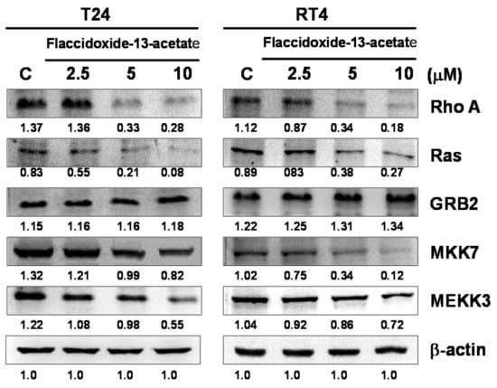 In the current study, we found that flaccidoxide-13-acetate inhibited the invasion and metastasis of T24 and RT4 bladder cancer cells, and the inhibition effect proceeded in a concentration-dependent manner. Furthermore, tumor invasion- and metastasis-associated proteins, such as RhoA, Ras, MKK7 and MEKK3, were found to be inhibited by flaccidoxide-13-acetate treatment. A study by Lin et al. [34] found that curcumin treatment reduced the expressions of RhoA, MMP-2 and MMP-9 in mouse–rat hybrid retina ganglion cells (N18). In fact, previous study of human vascular endothelial cells (HMEC-1) demonstrated that RhoA can induce MMP-9 expression and promote endothelial cell invasion [35].