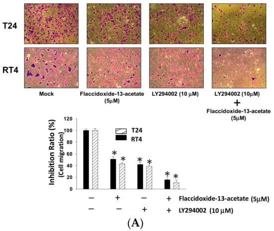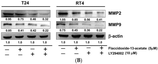 To further examine the association between flaccidoxide-13-acetate with the aforementioned PI3K/AKT/mTOR pathways, LY292400, a PI3K inhibitor, was used to elucidate the effects on cell migration inhibited by flaccidoxide-13-acetate through PI3K/AKT/mTOR pathway. The results indicated that the cell migration of the flaccidoxide-13-acetate-treated T24 and RT4 cells reduced from 80% to 41% after treatment with LY292400 (10 mM) (Figure 6A). Furthermore, the expression levels of MMP-2 and MMP-9 were shown a significant reduction in flaccidoxide-13-acetate—treated T24 and RT4 cells with the addition of LY292400 (Figure 6B). Therefore, we proposed that the cell migration of T24 and RT4 cells should be suppressed by flaccidoxide-13-acetate through PI3K/AKT/mTOR pathway.