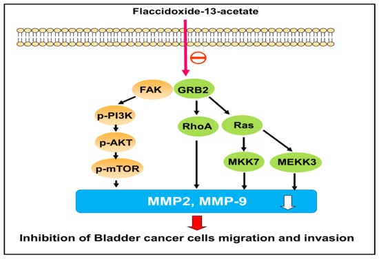 In conclusion, this study demonstrated that flaccidoxide-13-acetate inhibits the migration and invasion of T24 and RT4 bladder cancer cells through the down-regulation of MMP-2 and MMP-9 expressions, and the process is controlled by the FAK/PI3K/AKT/mTOR pathway (Figure 7). Our findings suggested that flaccidoxide-13-acetate has the potential to be developed as new drug for control of the invasion and metastasis of bladder cancer cells.