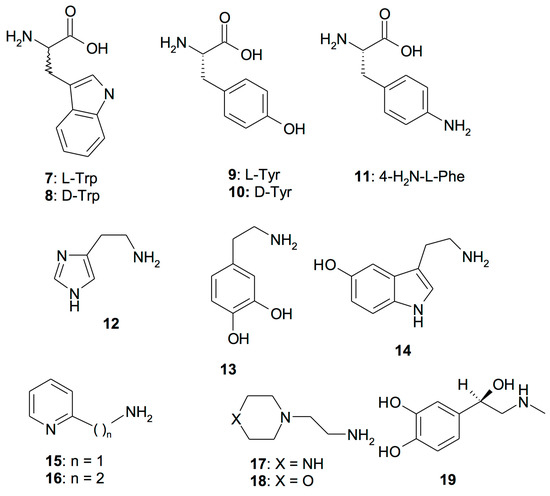 As deduced from the primary structure, the CruCA4 amino acid sequence contains most of the typical features of an α-CA, such as the three histidine residues, involved in the metal-coordination, and the two gatekeeper residues, involved in the binding of inhibitors. CruCA4 lacks the proton shuttle residue His64 (following the hCAI numbering system), the residue involved in the restoration of the catalytic active form of the enzyme through the transfer of a proton from the water coordinated Zn(II) ion to the environment. CruCA4 has a residue of Lys instead of His in position 64. This substitution, as demonstrated for other CAs, leads to a decrease in the kcat value [41,42]. Thus, the treatment of the enzyme with CAAs represents a very good strategy for stimulating the biomineralization process of the organism through the increase of the enzymatic activity of CruCA4. We want to stress the fact that this enzyme is involved in the formation of the coral skeleton. Thus, activators 1–19 have been investigated as CAAs to be used in conjunction with CruCA4 (Figure 1). Figure 1 includes both natural and non-natural amino acids and amines.