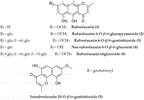 Sample Availability: Samples of the compounds (rubrofusarin, rubrofusarin 6-O-β-d-glucopyranoside, rubrofusarin 6-O-β-d-gentiobioside, nor-rubrofusarin 6-O-β-d-glucoside, isorubrofusarin 10-O-β-d-gentiobioside, and rubrofusarin 6-O-β-d-triglucoside) are available from the authors. |