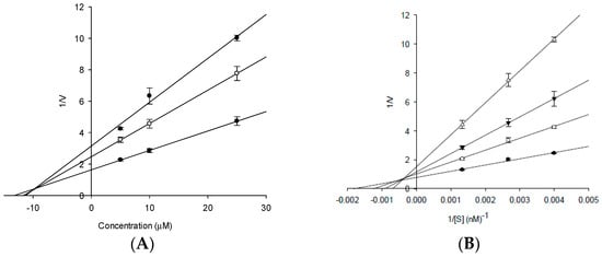 Dixon plots and Lineweaver-Burk plots for acetylcholinesterase (AChE) inhibition by 3. The results showed the effects of presence of different concentrations of the substrate (0.6 (●), 0.3 (○), and 0.1 mM (▼)) for (A) and the effect of presence of different concentration of 3 (0 (●), 4 (○), 20 (▼), and 50 µM (△)) for (B).