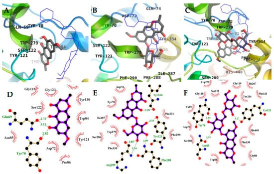 Inhibition mode of 1 (A); 2 (B); and 3 (C) for the AChE allosteric site with donepezil (blue line) (A). 2D ligand interaction diagram of AChE allosteric inhibition by 1 (D); 2 (E); and 3 (F). Dashed green lines indicate H-bonds. Carbons are in black, nitrogens in blue, and oxygens in red.