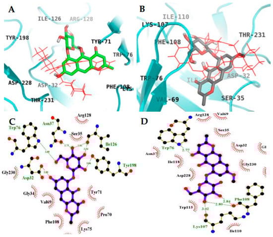 In our study, 1–3 were tested for AChE, whereas 2 and 4 into the binding site for BACE1 using the Autodock 4.2 software. The crystal structures of the AChE and BACE1 protein targets were acquired from the RCSB Protein Data Bank with the respective accession codes 1acj and 2wjo, respectively. The co-crystallized ligands, tacrine and QUD, were used to generate the grid box for catalytic inhibition mode, whereas reported allosteric inhibitors, donepezil and PMF, were used to generate the grid box for allosteric inhibition mode [,], and their three-dimensional (3D) structures were downloaded from PubChem Compound (NCBI), with compound CIDs of 3152 and 97,332, respectively. The 3D structures of rubrofusarin and its derivatives were drawn with ChemDraw Ultra 12.0 (CambridgeSoft, Cambridge, MA, USA), and their pKa values were computed at crystallographic pH (pH = 7.5) using the MarvinSketch (ChemAxon, Budapest, Hungary). PyMOL 1.7.4 and Ligplot+ were used for visualization and analysis of results.