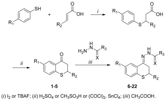 Thiochroman-4-ones were prepared by addition of thiophenol or 4-fluorothiophenol to α,β-unsaturated carboxylic acids (acrylic, crotonic or cinnamic acid) (Scheme 1). The resulting carboxylic acids undergo a ring closing reaction upon treatment with sulfuric or methanesulfonic acid to give the thiochroman-4-ones; in the case of thioflavanone ring closing reaction was carried out with oxalyl-chloride followed by tin chloride. Resultant ketones were condensed with acyl hydrazides (benzoic hydrazide, isonicotin-hydrazide, semicarbazide or thiosemicarbazide) and afforded the desired acyl-hydrazones in moderate to good yields.