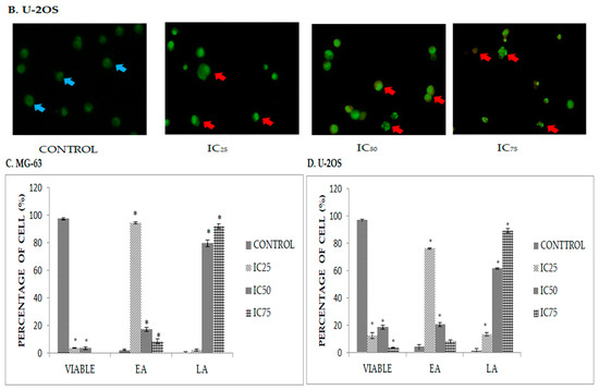 (A) Distinct morphological changes in MG-63 after 48 h of treatment with DK1 (IC25 (6.6 µM), IC50 (23.8 µM), and IC75 (30 µM)); (B) Distinct morphological changes in U-2OS after 48 h treatment with DK1 (IC25 (2.2 µM), IC50 (19.6 µM) and IC75 (30 µM)); (C,D) Quantification analysis of MG-63 and U-2OS based on cells uptake of acridine orange and propidium iodide in 200 cells. (Blue arrow: viable; red arrow: apoptosis). EA (early apoptosis), LA (late apoptosis). All data are expressed as mean ± standard error mean (S.E.M). * p < 0.05 compared with corresponding controls (Magnification: 200×).