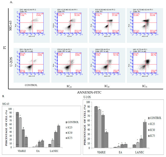 Acridine orange/propidium iodide (AO/PI) double staining assay was conducted to examine the cell death of osteosarcoma cells microscopically. By using this staining assay, the morphology and cellular profiles for viable, apoptotic and necrotic cells can be distinguished [13]. Viable cells with intact membranes will stain green, whilst early apoptotic cells will stain with a green color but are distinguished by occurrences of distinct features such as membrane disruption, while late apoptosis/necrosis will stain red [13]. Around 200 populations of cells were quantified for statistical analysis [13]. Based on MTT assay, three different inhibition concentrations (IC25, IC50, and IC75) for DK1 were obtained and subsequently used to treat both MG-63 and U-2OS cell lines for 48 h. Figure 2 represents the fluorescence photomicrographs of MG-63 and U-2OS osteosarcoma cell lines 48 h post treatment with three different concentrations of DK1. Based on Figure 2 around 90% of viable cells were prominent in control samples of both MG-63 and U-2OS. However, when both cell lines were exposed to DK1, the viable cells’ percentage significantly decreased below 20% viability. At 48 h post-treatment for the MG-63 and U-2OS cell lines, the increment of apoptotic cells was found to be in a dose-dependent manner. Based on Figure 2A,B early apoptotic features can be clearly observed even at the lowest concentration of IC25. These results may suggest that DK1 is capable of inducing apoptosis in MG-63 and U-2 OS at all concentrations and the percentage of apoptotic cells increases with dosages of IC50 and IC75.