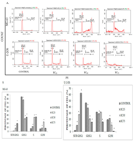 Cancer cells are known to undergo an irregular cell cycle progression due to mutations that occur in their genetic code and the abundance of growth factors surrounding it [6,17]. In order to disrupt this process, DK1 dysregulates cell cycle activity by interrupting the cell cycle checkpoint, rendering the cell more susceptible to damage [17]. In order to determine whether DK1 is able to interfere with cell cycle progression, cell cycle analysis was conducted through DNA staining with PI. Shown in Figure 4, the percentage of cells undergoing sub G0/G1 phase reflecting apoptotic cells in both cell lines MG-63 and U-2OS gradually increased to 18% and 61% respectively, as compared to the control when exposed to three different concentrations of DK1 (IC25, IC50, IC75) for 48 h. However, significant cell cycle arrest at S phase was only observed in MG-63 compared to U-2OS.