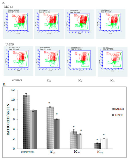 (A) Histogram analysis of the depolarization of mitochondrial membrane potential for MG-63 and U-2OS after being treated with three different concentrations of DK1 (IC25, IC50, IC75) at 48 h; (B) Quantification analysis of mitochondrial membrane analysis for MG-63 and U-2OS when treated with three different concentrations of DK1. All data are expressed as mean ± standard error mean (S.E.M). * p < 0.05 compared with corresponding controls.