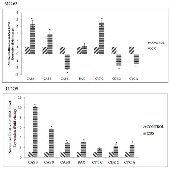 qPCR analysis of apoptosis and cell cycle related genes; caspase 3 (CAS 3), caspase 8 (CAS 8) and caspase 9 (CAS 9), BAX, cytochrome c (CYT C), Cdk 2 (CDK 2), cyclin A (CYC A) for MG-63 and U-2OS when treated DK1 (IC50) for 48 h. Expressions of all target genes were normalized to ACTB and 18srRNA. All data are expressed as mean ± standard error mean (S.E.M). * p < 0.05 compared with corresponding controls. The significance for this assay was set at >2 fold changes, comparing between the control (untreated) group and the treated groups.