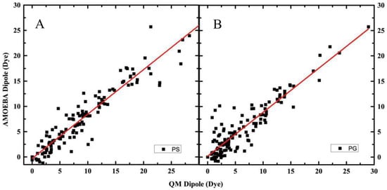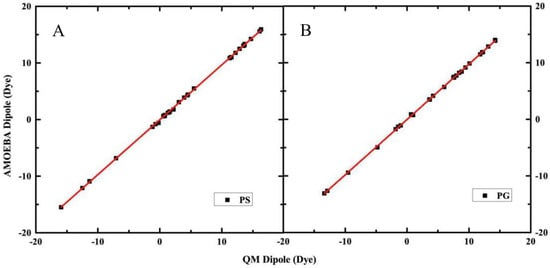 It is also essential to ensure the electrostatic parameters suitable for most different conformations of the headgroup, which means the transferability of the electrostatic properties. The electrostatic properties of headgroup are validated using the comparison of the total of dipole and the x-, y-, z-components moment, and the electrostatic potential on grids around the headgroup. A total of 6 conformations of PG and PS headgroups were selected as the validation set, and these structures were different from the four conformations of “training” set used in the parameterization. In Figure 2, the comparison of headgroup molecular dipole x-, y-, z-components predicted by AMOEBA against QM (MP2/6-311++G(2d,2p)) is presented. Figure 2 shows that the total and xyz components of the headgroup dipole moment are well reproduced in the different conformations using the AMOEBA parameters with a correlation coefficient (R2) of 0.999 for both PG and PS headgroup, and AMOEBA shows a perfect slope 0.97 for PS headgroup, and 0.98 for PG headgroup. The intercept is only −0.03 dye for PS, and −0.04 dye for PG headgroup. The standard and unsigned average errors are 0.11 and 0.28 Dye for PS, 0.25 and 0.48 dye for PG headgroup predicted by AMOEBA.