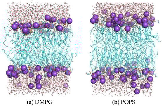 - Mukhopadhyay, P.; Monticelli, L.; Tieleman, D.P. Molecular dynamics simulation of a palmitoyl-oleoyl phosphatidylserine bilayer with Na+ counterions and NaCl. Biophys. J. 2004, 86, 1601–1609. [Google Scholar] [CrossRef]