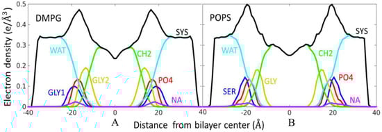 The electron density profiles (EDP) were calculated as first dividing the system into slabs along the bilayer normal, and summing the electron charges in each slab, then dividing by the slab volume. The electron charge is equal to the atomic number, minus the partial charge of the atom, without considering the atomic dipole and quadrupole contribution. The EDP for DMPG and POPS systems is shown in Figure 6. The EDP is decomposed into contributions from the following group: water, carbonyl glycerol groups (GLY, GLY1, GLY2 group), the phosphate (PO4 group), methylene unsaturated CH=CH terminal methyl (CH2). All of these profiles are symmetrical, and the results show that water penetrates up to carbonyl and glycerol group, and leaves the two tail hydrophobic methyl groups. From the profile of Na+, it should be noted that the peaks of Na+ are near the peaks of the phosphate group for both DMPG and POPS lipids, which means that the most Na+ ions locate near the phosphate group and interact with oxygen of phosphate group. From the EDP, the thickness of the DMPG and POPS bilayers can be calculated as the distance between the two peaks (see Table 1). The thicknesses of bilayers are 33.9 Å for DMPG system and 38.7 Å for the POPS system. The result of AMOEBA for DMPG is well agreement with experimental value, 33.8 Å []. From Figure 5, it can be seen that the Na+ almost located near the phosphate group, which is consistent with the EDP analysis.