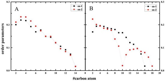 The order parameters for bilayer system averaged over the last 20 ns simulations. (A) The order parameters for DMPG bilayer system; (B) The order parameters for POPS bilayer system.