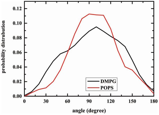 The orientation of the DMPG and POPS headgroups is analyzed by measuring the angle between the phosphrous-C2 of glycerol for DMPG, and phosphrous-nitrogen vector and the bilayer normal for POPS. The probability distribution of the angle is plotted in Figure 8. The importance of the orientation in modulating the hydration of interfacial region has been discussed []. The most probable angle from AMOEBA simulations are about 90° of DMPG system and 100° of POPS system, in comparison with the experimental order []. The probability distribution of POPS is also narrower than those observed in DMPG, which suggesting a more restricted range of rotation angle for phosphate and serine group.