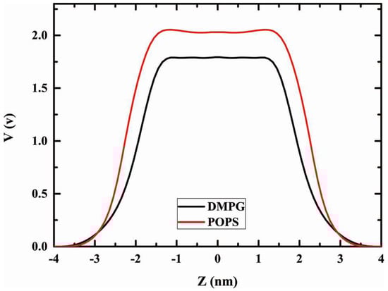 The induced dipole at each atomic site can be obtained from the simulations. Figure 9 shows the profile of electrostatic potential computed from the simulation. The potential difference [] was calculated from Equation (8), and the values between water and membrane are 1.79 V for DMPG and 2.03 V for POPS. The potential barrier at the lipid-water interface was shifted from the center of bilayer, which derives from the strong ordering of water molecules around the phosphate group of the lipids. This is primarily due to differences in electrostatic representation. Induced polarization in the polarization in the interfacial region, is a particularly important property that cannot be captured by a force field with fixed partial charges.