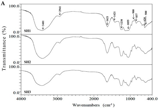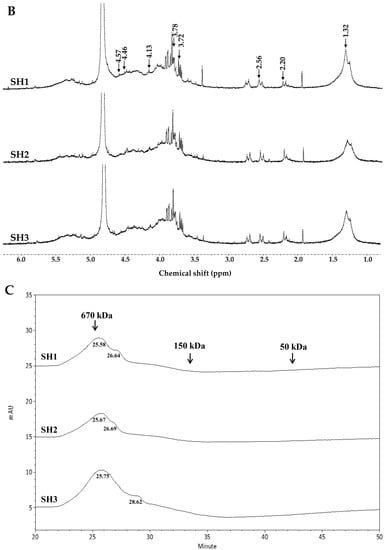 Characteristics of fucoidan extracts obtained from S. hemiphyllum under different compressional-puffing pretreatments. (A) FTIR spectra for SH1, SH2, and, SH3. Absorption bands at 3401, 2941, 1621, 1421, 1230, 1055, 900, 837, 620, and 580 cm−1 are indicated; (B) 1H-NMR spectra for SH1, SH2, and SH3. Chemical shifts at 4.57, 4.46, 4.13, 3.78, 3.72, 2.56, 2.20, and 1.32 ppm are indicated; (C) size exclusion chromatographic profiles for SH1, SH2, and SH3. Dextrans with molecular weights 670, 150, and 50 kDa were utilized as the standards.
