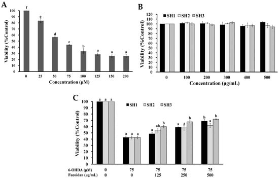 Effects of crude extracts of fucoidans (SH1, SH2, and SH3) and 6-OHDA treatment with or without SH1–SH3 pretreatment on cell viability of SH-SY5Y cells: (A) SH-SY5Y cells were treated with 6-OHDA (0–200 μM) for 24 h, and cell viability was assessed. Values are expressed as the mean ± SD (n = 3); (B) SH-SY5Y cells were treated with SH1, SH2, or SH3 (0–500 μg/mL) for 24 h, and cell viability was assessed. Values are expressed as the mean ± SD (n = 3); (C) SH-SY5Y cells were pretreated with SH1, SH2, or SH3 (0–500 μg/mL) for 6 h, followed by treatment with 75 μM 6-OHDA for 24 h, and cell viability was assessed. Values are expressed as the mean ± SD (n = 3). Different letters (in a, b, c, d, e, and f) mean statistically significant differences at p < 0.05. In each group of columns related to each concentration of fucoidan, the means that have at least one common letter do not differ significantly (p > 0.05).
