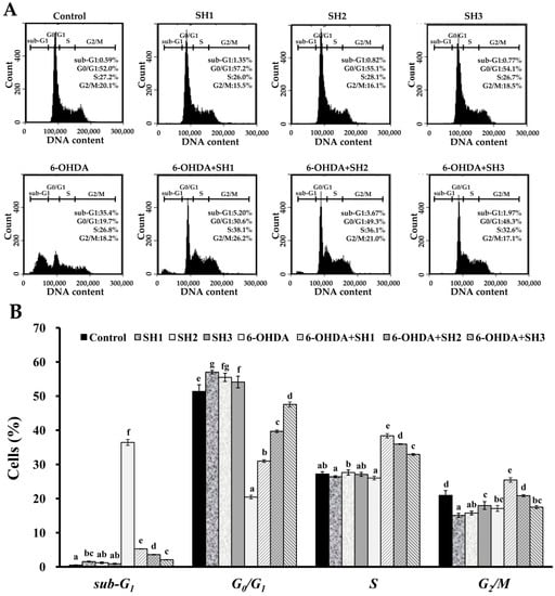 Effects of 6-OHDA treatment with or without SH1–SH3 pretreatment on cell cycle profiles of SH-SY5Y cells: (A) SH-SY5Y cells were pretreated with SH1, SH2, or SH3 at a concentration of 500 μg/mL for 6 h, followed by treatment with or without 75 μM 6-OHDA for 24 h, and cell cycle profiles were assessed; (B) summarizing bar graph of three cell cytometric analyses showing the percentages of cells in the sub-G1, G0/G1, S, and G2/M phases of the cell cycle according to treatments after analysis using BD Accuri C6 software. Results are shown as mean ± SD of three independent experiments. Different letters (in a, b, c, d, e, f, and g) mean statistically significant differences at p < 0.05. In each group of columns related to each cell cycle phase, differences exist between columns labeled with different letters, p < 0.05.