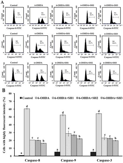 Effects of 6-OHDA treatment with or without SH1–SH3 pretreatment on active caspase-8, -9, and -3 in SH-SY5Y cells: (A) SH-SY5Y cells were pretreated with SH1, SH2, or SH3 at a concentration of 500 μg/mL for 6 h, followed by treatment with 75 μM 6-OHDA for 24 h, and fluorescence histograms of immunolabeled caspase-8, -9, and -3 were assessed; (B) summarizing bar graph of three cell cytometric analyses and showing the percentages of cells with highly fluorescent intensity according to treatments after analysis using BD Accuri C6 software. Results are shown as mean ± SD of three independent experiments. Different letters (in a, b, c, and d) mean statistically significant differences at p < 0.05. In each group of columns related to each type of caspase, differences exist between columns labeled with different letters, p < 0.05.