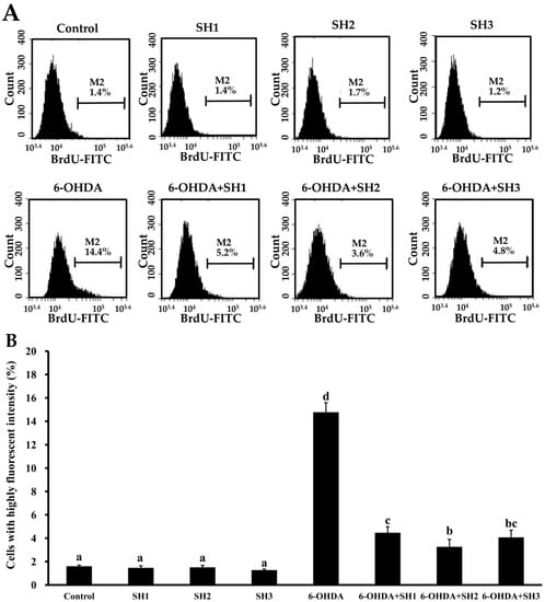 Effects of 6-OHDA treatment with or without SH1–SH3 pretreatment on the extent of DNA fragmentation in SH-SY5Y cells: (A) SH-SY5Y cells were pretreated with SH1, SH2, or SH3 at a concentration of 500 μg/mL for 6 h, followed by treatment with or without 75 μM 6-OHDA for 24 h, and fluorescence histograms of immunolabeled BrdU were assessed; (B) summarizing bar graph of three cell cytometric analyses showing the percentages of cells with highly fluorescent intensity according to treatments after analysis using BD Accuri C6 software. Results are shown as mean ± SD of three independent experiments. Different letters (in a, b, c, and d) mean statistically significant differences at p < 0.05. Differences exist between columns labeled with different letters, p < 0.05.