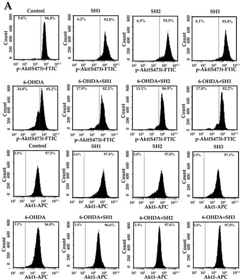 PI3Ks/protein kinase B (PKB or Akt) pathway has vital roles in the differentiation, survival, cell cycle, metabolism, cytokine production, growth, and activation of B cells [40]. Previous studies suggested that the PI3K/Akt pathway is involved in the prevention of apoptotic cell death in a PD model of SH-SY5Y cells [41]. We thus evaluated the expressions of phosphorylated Akt (p-Akt) and total Akt (Akt1) in cells by flow cytometry. As shown in Figure 7A,B, it was found that fucoidan extracts SH1–SH3 possessed a cytometric profile of p-Akt and Akt1 expressions that was similar to that of SH-SY5Y cells as compared to the control. When cells were treated with 75 μM 6-OHDA, the population of high fluorescent cells significantly decreased from 94.50% ± 0.14% (control) to 64.10% ± 0.79%, indicating the occurrence of dephosphorylation of Akt. Conversely, when cells were treated with 75 μM 6-OHDA in the presence of 500 μg/mL SH1, SH2, or SH3, the population of high fluorescent cells was significantly increased to 82.43% ± 0.24%, 86.27% ± 0.53%, and 82.90% ± 0.85%, respectively. These results clearly indicate that SH1–SH3 may protect SH-SY5Y cells from 6-OHDA-induced dephosphorylation of Akt in cells. In addition, when examining the expression of Akt1, it was found the expression level of Akt1 was not changed with respect to different treatments. Our results provide evidence that phosphorylation of Akt is involved in the preventive effects of SH1–SH3 on 6-OHDA-induced neurotoxicity. Further elucidation of the molecular mechanism and signaling cascade underlying the neuroprotective effects of SH1–SH3 (especially SH3) is warranted.
