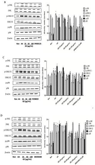 As shown in Figure 4B, compared with Non group, the proliferation of FLS in the AA group increased significantly (p < 0.01). GE (50 and 100 μg/mL) significantly inhibited the cell proliferation (p < 0.01). SP600125, PD98059, and SB203580 (10 μM) also had a significant inhibitory effect on cell proliferation (p < 0.01).