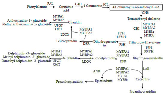 Anthocyanins and proanthocyanidins (PAs) are crucial factors that affect the quality of grapes and the making of wine [1,2,3]. The accumulation of anthocyanin is stimulated by various stimuli: sugar, plant hormones and other environmental factors (light, UV irradiation, temperature, wounding, drought) [4,5,6,7,8,9,10,11]. To promote anthocyanin accumulation, application of plant growth regulators has been proposed as an economically viable alternative. The biosynthesis mechanisms of anthocyanins and PAs has been deeply studied [2,12,13,14,15,16]. The anthocyanins and PAs are synthesized via the phenylpropanoid pathway and flavonoids pathway in the cytoplasm as shown in Figure 1 [17]. The biosynthetic pathway leading to anthocyanins and PAs is well known and the key regulatory genes controlling the pathway have been reported [18,19]. In anthocyanin biosynthetic pathway, genes encoding enzymes are divided into two groups: the upstream genes of anthocyanin biosynthetic pathway, such as chalcone synthase (CHS) and chalcone isomerase (CHI), and the downstream genes of anthocyanin biosynthetic pathway including dihydroflavonol reductase (DFR), leucoanthocyandin dioxygenase (LDOX), and UDP-glucose: flavonoid-3-O-glucosyl transferase (UFGT) [15,20,21,22,23].