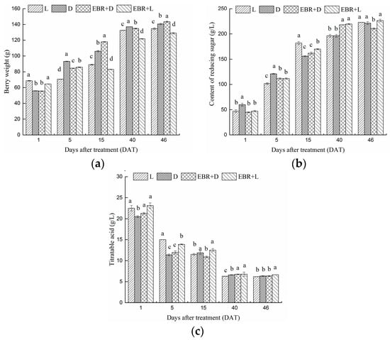 Grapes were treated at E-L35 phenological stage and collected from 1 DAT to 46 DAT. EBR treatment significantly influenced 100-berry weight under the darkness condition (Figure 2). From fruit version to maturity, 100-berry weight was dramatically increased (46 DAT, E-L 38), then increased slightly and reached maximum value at harvest. Bagging without EBR (D) treatment had no significant effects on 100-berry weight, but EBR + D treatments increased the 100-berry weight at 15 and 46 DAT. At harvest (46 DAT, E-L 38), the mean 100-berry weight was 2.04% (EBR + D) higher than that of the bagging without EBR (D). The result suggests that EBR treatment could increase 100-berry weight under darkness condition. Correspondingly, the four treatments had the same effects on reducing levels of sugar and titratable acid, which were significantly increased under the light exposure with EBR (EBR + L) treatments relative to D, L (L: light exposure without EBR) and EBR + D (Figure 2b,c). The EBR treatments (EBR + D, EBR + L) enhanced reducing sugar accumulation and decreased the total acid content. During berry development, the reducing sugar content and total acid content in juice of EBR-treated (EBR + D, EBR + L) berries were significantly higher and lower, respectively, than that of the D and L treatments. In addition, light exposure significantly increased the content of reducing sugar during berry development (Figure 2). The result showed that EBR was more effective in the light than dark in the synthesis of the reducing sugar.