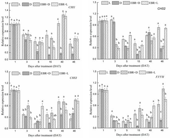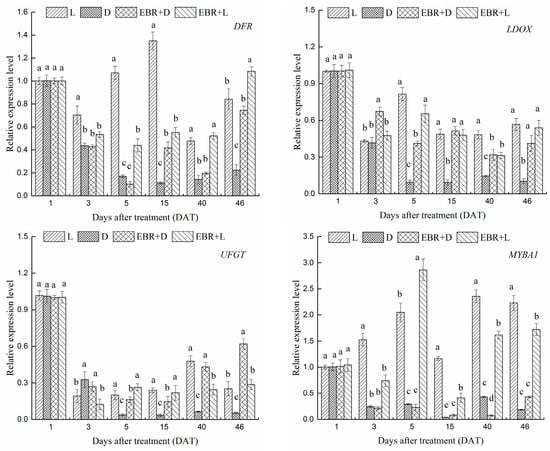 As shown in Figure 5, the treatment of EBR + L also increased the mRNA expression level of the transcriptional regulator gene VvMYBA1 at each sampling date, but D and EBR + D treatment severely suppressed the expression of this gene. The pattern of VvMYBA1 expression across the four treatments was similar to that of the anthocyanins content and suggested that both EBR and light were needed to induce its expression. The expression level of VvMYBA1 was significantly induced by light treatment, indicating that VvMYBA1 might be a light-responsive gene.