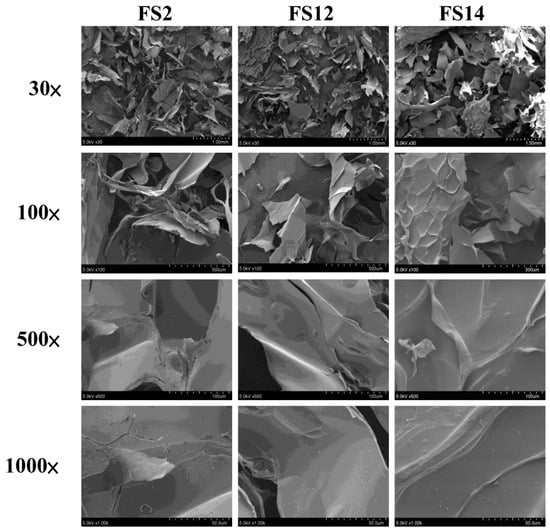 Scanning electron microscopy (SEM) micrographs of lyophilized FS2, FS12, and FS14. Magnifications are 30×, 100×, 500×, and 1000×, respectively.