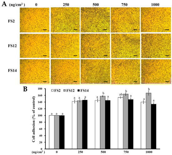 Effects of FS2, FS12, and FS14 on cell adhesion in HaCaT cells. (A) FS2, FS12, and FS14 were coated on the surface of plates at different concentrations, and then the HaCaT cells were seeded onto these plates; after 45 min, the cell adhesion activity was assessed, bar = 250 µm. (B) The bar graph summarizes the three cell adhesive experiments and shows the percentage of cell adhesion for FS2, FS12, and FS14 at different concentrations. The data are represented as means ± SD (n = 3). In each treatment concentration, different letters (in a and b) upon bars indicate significantly different (p < 0.05).